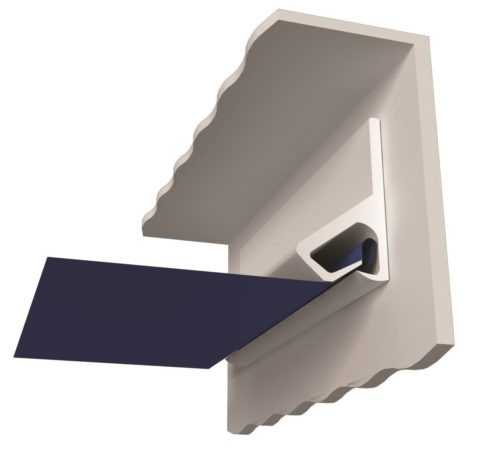 - Излишки полотна, которые могут выступать из-под крепежного профиля, обрезаются, а места заклинивания закрывают специальной декоративной планкой, напоминающей изящный плинтус. Она имеет гибкую уплотненную часть, которая защелкивается в профиль, благодаря чему полотно плотно прилегает к стене.