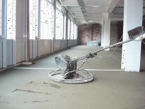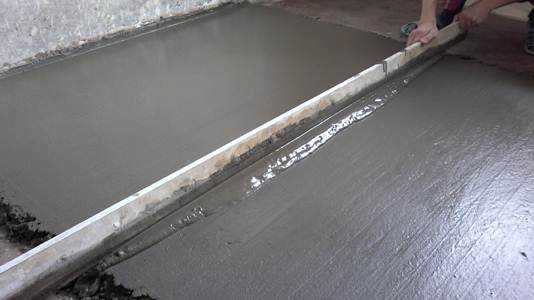 мая в стяжку бетонная смесь имеет подвижность П2, что соответствует осадке конуса от 6 до 10 см. Но в некоторых случаях могут применяться смеси для пола с иной подвижностью. Это зависит от способа укладки и интенсивности уплотнения. В случае, если автобетоносмеситель может подъехать вплотную к месту укладки, выгрузку бетонной смеси производят непосредственно на подготовленное основание. Если же работы производятся не на первом этаже или в тех случаях, когда автобетоносмеситель не может подъехать к месту укладки, используют бетононасос. - Вибромеханическая обработка и разравнивание бетона : Укладку и разравнивание бетонной смеси можно производить двумя способами: с помощью виброрейки по направляющим; с помощью правила по «маякам». При укладке и разравнивании бетонной смеси с помощью виброрейки необходимо сначала установить направляющие под виброрейку на уровне нулевой отметки и тщательно выставить их по горизонту. В процессе работы нужно следить за тем, чтобы направляющие не были сбиты. После этого на направляющие монтируется виброрейка. Бетонная смесь заливается на подготовленное основание и разравнивается с таким расчётом, чтобы её верх был немного выше уровня виброрейки (это зависит от степени уплотняемости бетонной смеси виброрейкой). После виброрейку тянут по направляющим. Бетонная смесь под действием вибрации оседает до нужного уровня и разравнивается. При этом нужно следить, чтобы виброрейка постоянно скользила по поверхности бетона.