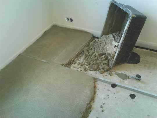 При укладке пола на существующее бетонное основание необходимо произвести его тщательную подготовку. Если в нем есть трещины, то их необходимо расширить и заполнить ремонтным составом, состоящим либо из полимера, либо из цементно-песчаной смеси на напрягающем цементе. Участки бетонного основания, не поддающиеся ремонту, необходимо полностью демонтировать и уложить новый бетон. Имеющиеся на отдельных участках основания перепады по высоте снимаются шлифовально-мозаичной или фрезеровочной машиной по бетону. Образовавшуюся при этом пыль удаляют при помощи промышленных пылесосов. В случае, когда перепады высоты на старом бетонном основании превышают 3 – 5 см, его необходимо выровнять подбетонкой.