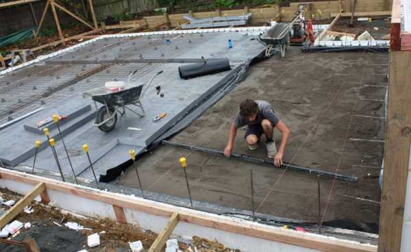 На подушку либо на старое бетонное основание укладывают гидроизоляцию. Чаще всего ее делают из рулонных битумных гидроизоляционных материалов либо полимерных мембран. Гидроизоляция нужна для того, чтобы основание не впитывало влагу из свежеуложенного бетона финишного покрытия, а также для предотвращения капиллярного подсоса влаги из грунта.
