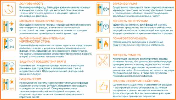 Технология монтажа вентфасада отличается многочисленными преимуществами. Среди достоинств, которые и сделали эту отделку такой популярной, необходимо отметить следующее: