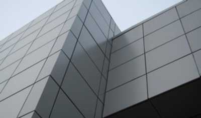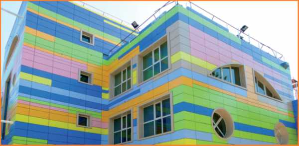 - Фасад из современных композитных материалов. Пожалуй, это наиболее распространенный материал для устройства вентилируемого фасада – он представляет собой пластик толщиной пару миллиметров, помещенный между двумя алюминиевыми накладками, которые задают основной тон и рисунок фасаду.