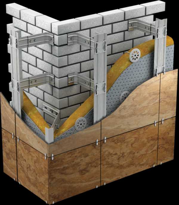 Конструкция вентилируемого фасада состоит из нескольких базовых элементов (или слоев), о которых важно упомянуть: