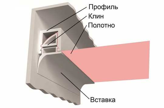 Второй вариант крепления получил название «штапиковый». Название обусловлено методом крепления материала. В паз на крепежном багете вставляется край покрытия, после чего, он расклинивается при помощи еще одной детали – штапика или клина.