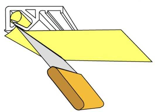 В данном случае используется клипсовый багет, поэтому для заправки в него полотна применяют закругленный шпатель. Заправку в профиль начинают параллельно по двум стенам от любого края (окно или дверь).