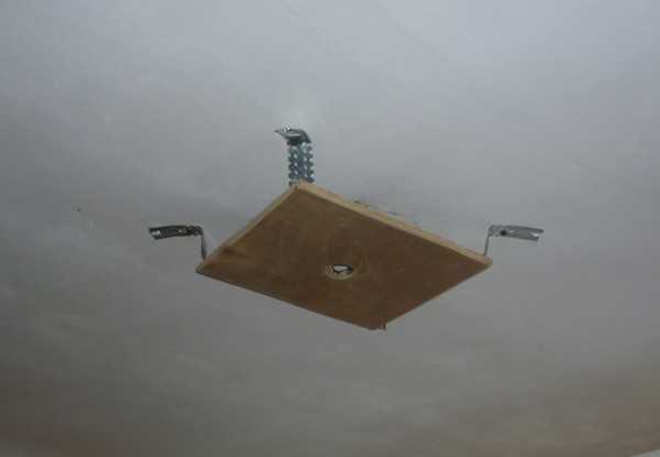 Проводка должна быть уложена в гофрированный рукав и закреплена к потолку хомутами. На закладную деталь будет в дальнейшем укреплена люстра.