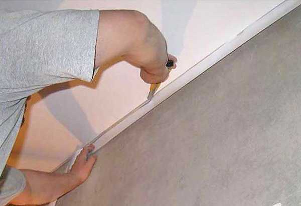 - После окончательного монтажа по периметру останутся куски материала, которые нужно срезать строительным ножом с новым острым лезвием. Будьте при этой операции предельно внимательны, чтобы при завершении работ не повредить потолок и не привести его в негодность.