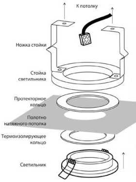 Фиксация подобной стойки, если она предусмотрена конструкцией, производится к основанию самого потолка. И такие модели светильников применяются исключительно для натяжных потолков, для гипсокартонных конструкций подходят светильники только без стоек. Их фиксация осуществляется за счет специальных лапок на пружинах.