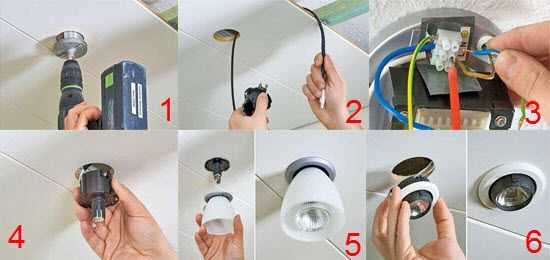 Сам монтаж точечных светильников не требует специальных навыков и не является очень трудоемким. Производят его по такому алгоритму: