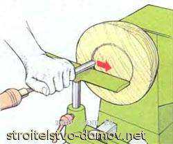 Сам процесс точения начинается с полного запуска вала. Когда будет набрана скорость, можно приступать к отделке древесины.