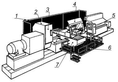 1 — заднее ограждение; 2 — ограждение патрона; 3 — дверь доступа; 4 — переднее ограждение; 5 — пульт управления; 6 — платформа; 7 — суппорт
