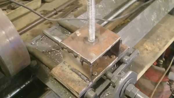 ![]() | Привариваем упор для шпильки. На торце станины, на месте задней бабки привариваем стальную полосу толщиной не менее 5 мм. В приваренной полосе сверлим сквозное отверстие, так, чтобы оно проходило по одной линии с центрами гаек, приваренных на салазках. |