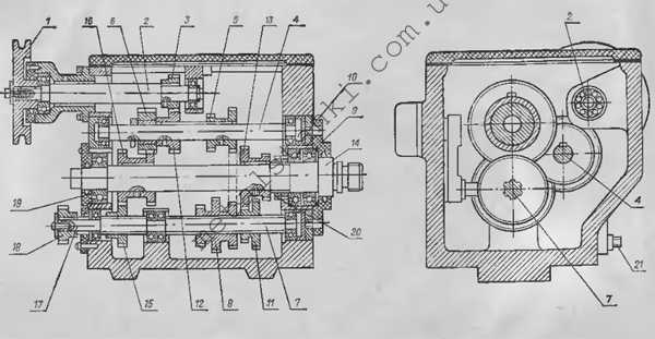 Вращение вала 17 передается шестерне 18, которая находится в постоянном зацеплении с шестернями передаточного механизма и далее с механизмом коробки подач.