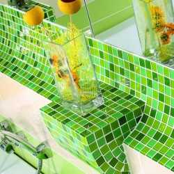 - Стеклянные отделочные материалы выполняются из жаропрочного стекла, которое имеет характеристики, схожие с керамической плиткой. Кроме того, стеклянная мозаика отличается необычным внешним видом.