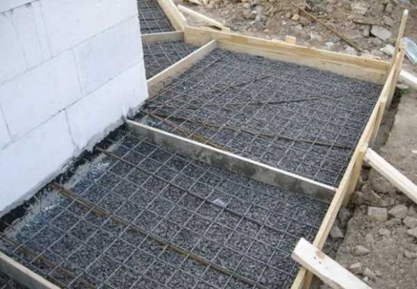 Наиболее прочной и долговечной является бетонная отмостка. Процесс ее изготовления начинается с подготовки песчаной подушки, как перед укладкой тротуарной плитки. Затем по периметру устанавливается опалубка так же, как и в предыдущем случае. До укладки арматуры желательно установить компенсаторы из деревянных планок толщиной около 15 мм. Компенсаторы должны располагаться перпендикулярно отмостке, т.е. межу фундаментом и опалубкой. Расстояние межу компенсаторами не должно превышать 2,5–3 метра.