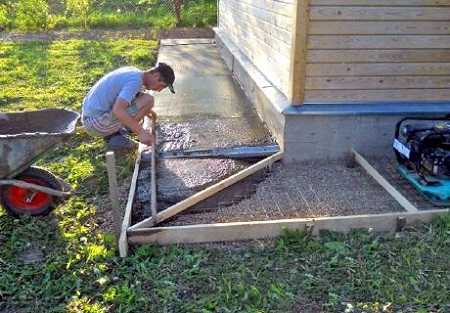 Бетонная смесь, которой заливается отмостка, должна быть умеренно густой и держать форму при выравнивании. Отмостка бетонируется последовательно — смесью заполняется секция между деформационными швами и поверхность выравнивается провилом по маякам, после чего заливается следующая секция.
