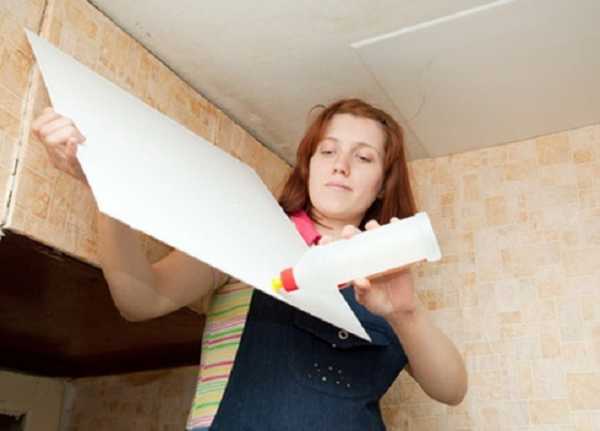 - замеряют места, в которых нужно приклеить куски плиток. Сегменты нарезают и крепят к потолку.