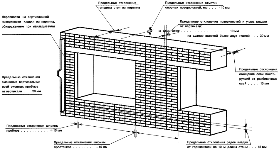 Государственные стандарты кирпичной кладки предписывают, чтобы горизонтальные швы составляли от 10 до 15 мм, а вертикальные швы — от 8 до 15 мм. Чтобы проверить толщину швов — измеряют толщину шва кирпичной кладки нескольких этажей и находят среднее значение данной величины.