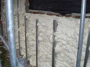 На утепляемую стену наносят вспененный утеплитель (например, пенополиуретан – если нет особых требований к отделке помещения), имеющий лёгкую ячеистую структуру.