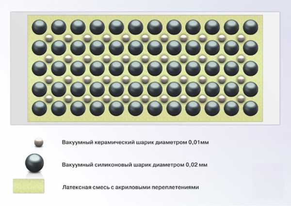 - Наполнители — керамические, полимерные или стеклянные сферы диаметром до 100 мкм, заполненные вакуумом или разреженным газом. Вид используемых материалов подбирается производителем. Полые шарики занимают основной объем изолирующего состава (около 90%), они существенно сокращают передачу тепла.