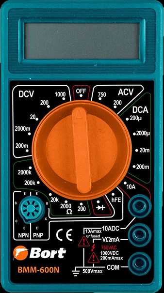Bort BMM-800Многофункциональный тестер Bort BMM-800 – очень удобный и дешевый измерительный инструмент. Термин «мультиметр» точно отражает назначение полифункционального прибора. Существующее количество предложений устройств на рынке на столько велико, что каждый квалифицированный инженер сможет подобрать себе инструмент, подходящий его особым требованиям как по предельным значениям измеряемых параметров, так и по набору функционала.