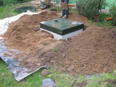 - Последний этап установки – выполнение обратной засыпки котлована. Для этой цели используется смесь сухого цемента с песком. По мере выполнения засыпки станцию нужно наполнять водой, чтобы не допустить деформацию корпуса.