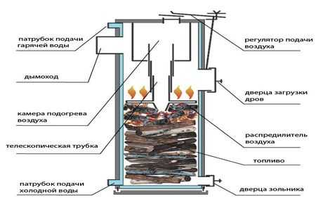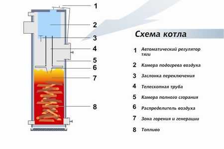 Для подачи воздуха в камеру длительного горения используется раскладная трубка, имеющая распределитель. В верхней части этой камеры находится заслонка, регулирующая доступ воздуха.
