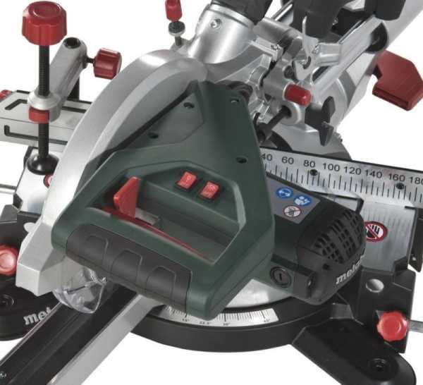 - Режущая головка. Установлена непосредственно на поворотном столе – она изменяет свое местоположение вместе с ним. Для удобства в работе сбоку поворотного стола на станине нанесена градуированная шкала – совмещая метку стола с определенным значением градусов, можно производить резы под любым углом. И это еще не все – сама головка, а вернее ее режущая часть, может наклоняться влево и вправо, обеспечивая тем самым наклонный рез. В большинстве случаев этот наклон выполняется в одном или двух фиксированных положениях (30˚ и 45˚ в любую сторону). Также некоторые модели могут оборудоваться специальным протяжным механизмом. Торцовочная пила с протяжкой позволяет разрезать заготовки куда большей ширины, чем обыкновенный ее собрат.
