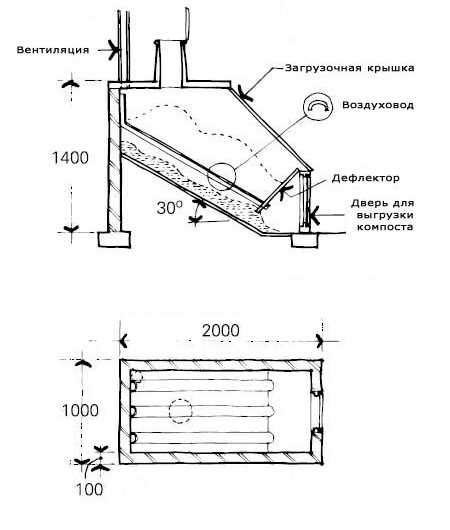 На фото схема торфяного компостирующего туалета При организации компостного туалета на даче своими руками накопитель выполняется в качестве резервуара с наклонным дном (порядка 25-30 градусов) для самопроизвольного движения массы отходов. Размер конструкции может составлять в длину порядка 2-3 метров, а в ширину 1-2 метра. С помощью такого торфообразователя можно утилизировать также и кухонные отходы. Оптимально, если люк сброса будет располагаться рядом с туалетом.Перед тем, как сделать торфяной биотуалет для дачи своими руками, нужно знать, что при самостоятельной постройке такой конструкции важно уделить должное внимание прочности всех поверхностей (пола, стен, потолка) и наличию надежного герметизирующего влагонепроницаемого слоя.