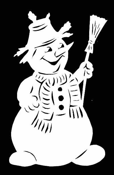 Очаровательные добряки-Снеговики обязательно должны украсить новогодний дом. Их фигурки просто вырезать симметричными, а можно сделать «семейное фото Снеговиков» или композицию с елочкой и детьми.