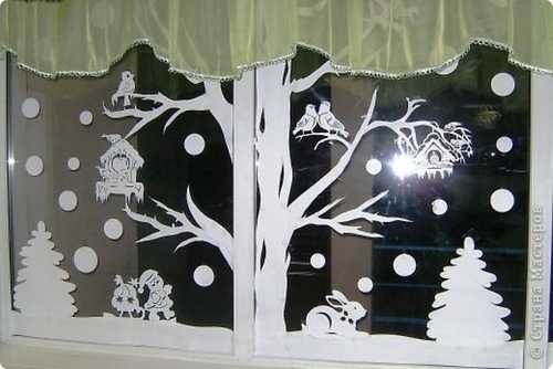 Можно сделать нестандартное новогоднее украшение. Для этого вырезаем из бумаги силуэты любимых питомцев, героев сказок и мультфильмов, птиц и животных в сказочном зимнем лесу.