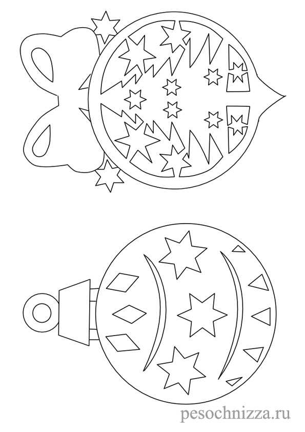 Елочные игрушки можно вырезать как по симметричной схеме, так и по индивидуальному трафарету. Этими украшениями можно дополнить композицию на окне, нарядить на елочку, прикрепить их нитями к люстре или гардине.