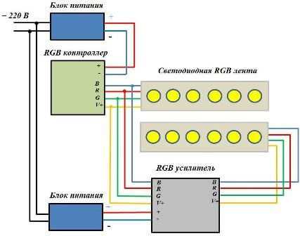 Подключение «трехцветных» (RGB) светодиодных лент имеет некоторые особенности. RGB ленты обычно работают со специальными контролерами. Поэтому при подключении трехцветных светодиодных лент к блоку питания подключается не сама лента, а контроллер, который в свою очередь питает светодиоды. Также существует ограничение на длину ленты подключаемой к контроллеру. Поэтому для наращивания цепочки светодиодных лент используются специальные усилители. Эти усилители также должны получать энергию от блока питания.