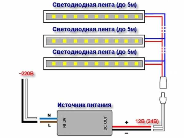В зависимости от типа диодного ленточного осветителя подбирается стандартная схема подсоединения: