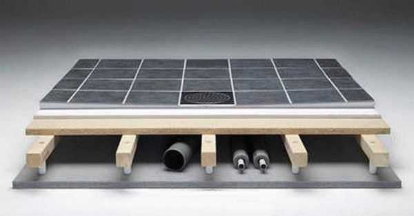 - Сделать полна деревянных лагах. Лаги устанавливаются «конвертом» с центром в месте расположения сливного трапа. В общих чертах технология такая: в стяжке пола сверлятся отверстия под установку шпилек (М14-М16), шаг установки — около 30 см. На шпильки крепятся лаги (40*60 мм или 45*90 см — от размеров возводимого подиума). Лаги укладываются (можно подтесать) с учетом создания требуемого уклона. На них — влагостойкая фанера 12 мм или толще, затем ГВЛ, гидроизоляция, на нее — плитка.