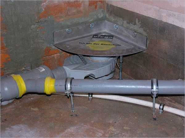 Первым делом выводят от канализационного стояка отвод, куда будет стекать вода. Канализационную трубу кладут с требуемым уклоном (2 см на 1 метр), раструб располагают в предполагаемом месте подключения трапа. После того как канализационный выход установлен, берут трап, делают предварительную разметку — надо на стенах душевой кабины отметить высоту стяжки: