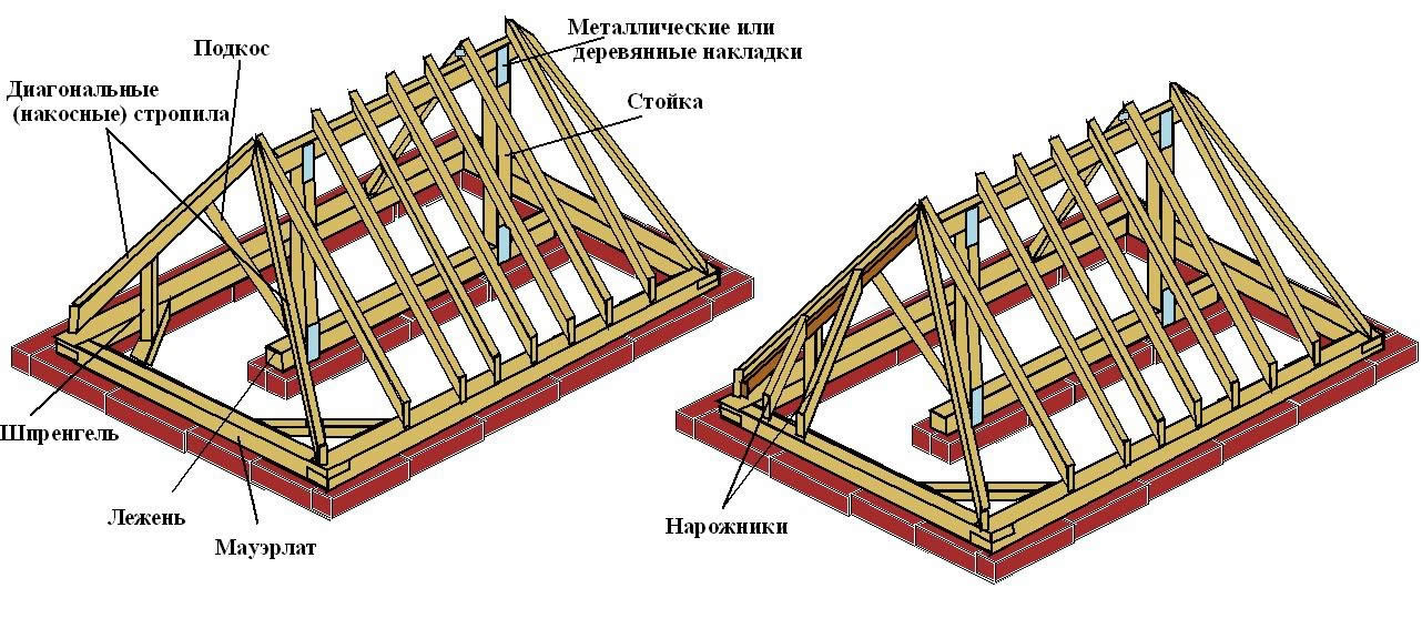 Для трехскатных крыш выделяют два возможных типа стропильных систем: