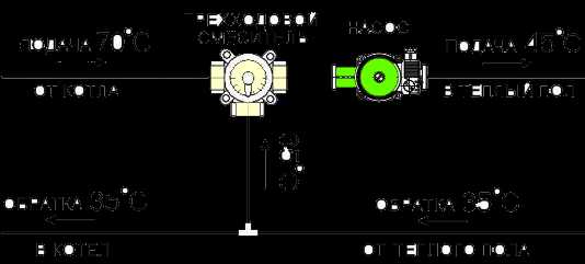На пути горячего теплоносителя к коллектору находится трёхходовой клапан с термостатом. Если температура входного потока превышает допустимую для тёплого пола, то срабатывает клапан. Холодная обратка подмешивается к горячей. Когда температура достигает нужного значения, термостат заставляет клапан сработать снова.