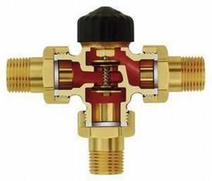 Трёхходовые клапаны изготавливают из разных сплавов, например, латуни, бронзы. Смесительный клапан очень похож на тройник с шайбой для изменения температуры сверху. Он имеет три патрубка и работает по принципу смесителя. Один вход — для поступления горячего теплоносителя. Через второй патрубок проходит обратка, т. е. остывшая вода. Третий предназначен для выхода смеси нужной температуры. Внутри крана находится закрытая ёмкость цилиндрической формы, заполненная термочувствительным веществом. При нагревании вещество (газ или жидкость) увеличивается в объёме. Расширяясь, оно давит на исполнительный элемент терморегулятора и приводит механизм в работу.