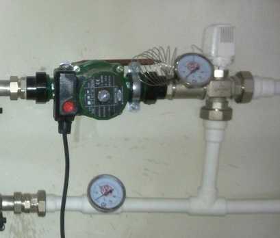 - Для тёплого пола, который будет занимать большие площади, используют узел подмеса. Это устройство представляет целую систему из коллектора подачи и обратки, циркуляционного насоса и термостатического смесителя.