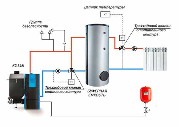 Для того чтобы в короткий промежуток времени поднять температуру в буферной емкости нужно подать в нее поток с высокой температурой, которая не нужна в СО. Термосмесительный клапан служит для понижения температура воды, идущей от бака на радиаторы. Устанавливается данный прибор а отопительный контур (после емкости).