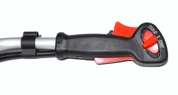 Положение «START» предназначено для запуска холодного двигателя (на повышенных оборотах), положение «I» для обычного запуска (теплый двигатель), а положение «STOP» — для остановки двигателя. Пока рычаг блокировки не нажат, регулятор газа фиксирован, что способствует безопасности работы. От себя добавлю, что рукояти прорезинены и очень удобны в использовании: