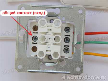 В самом механизме выключателя следует отделить общую клемму, на которую следует подключать фазный провод и клеммы, от которых будет подано напряжение на отдельных осветительных секций. Как правило, эти контактные группы разделены по отдельным колодкам и размещаются на тыльной стороне устройства.