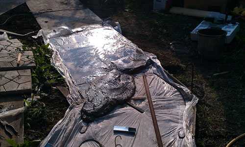 Таким образом, ряд за рядом, укладываются основные большие плахи, с наиболее возможным заполнением пространства. Те места, которые не удалось заполнить, закрываются специально вырезанными фрагментами плитняка. Именно для этого и нужна медная проволока. Этой проволокой можно делать контур незакрытой поверхности и наносить мелом на подходящий камень, а затем обрезать болгаркой.