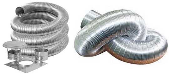 Гофрированная труба из нержавеющей стали для дымохода применяется для осуществления криволинейных переходов. Данные изделия из иных материалов редко могут похвастаться прочностью и устойчивостью к температурам. Гофрированная стальная конструкция легко переносит нагрев до 900 °C и довольно хорошо убирает продукты горения камина, котла, печи и т.п.