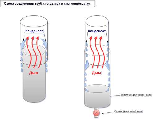 -первый принцип, именуемый «по дыму», предусматривает наличие в системе тройника для отвода конденсата;