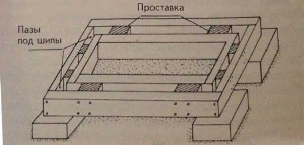 Стороны нижней обвязки делаются из двух отрезков обрезной доски, сбитых гвоздями через проставку той же толщины, как это изображено на рисунке ниже.