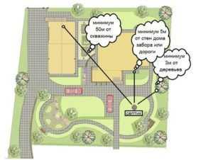Схема расположения туалета на участкеУстанавливая биотуалет или септик, нужно соблюдать все санитарные нормы, которые предъявляются к такого рода утилизаторам продуктов жизнедеятельности.