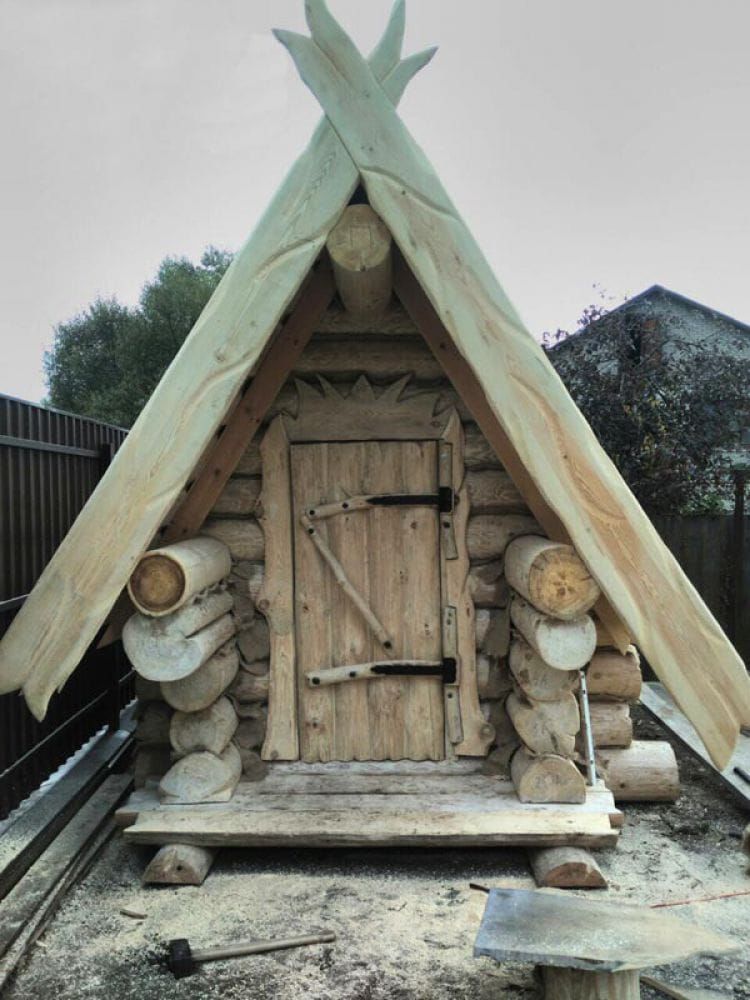 Если стандартный проект дачного туалета вас не устраивает, так как хочется видеть на участке более оригинальную конструкцию, которая будет служить украшением экстерьера, можно выполнить туалет в виде шалаша или терема.