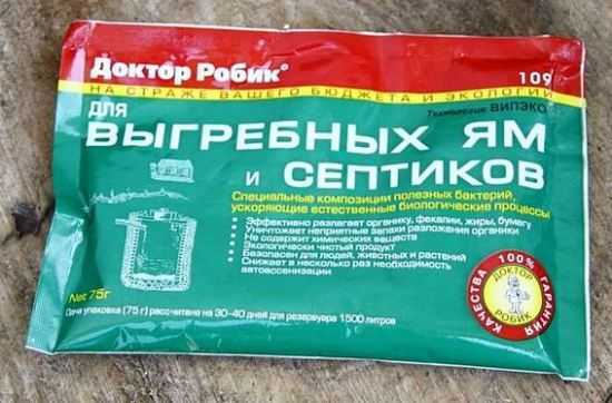 - Доктор Робик. Препарат содержит шесть различных видов микроорганизмов, которые справляются не только с биологическими отходами, но и с бытовой химией. Разводится препарат в воде и выливается в выгребную яму или септик. При этом происходит снижение уровня заполнения, а через некоторое время запах исчезает.